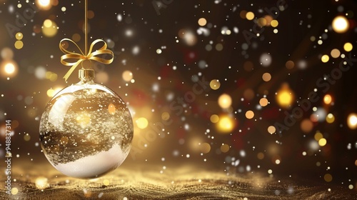 Christmas background. Xmas ornaments Glass ball with snow inside. Christmas tree decorations transparent ball hanging on golden ribbon, gold glitter confetti. Realistic 3d design. vector illustration