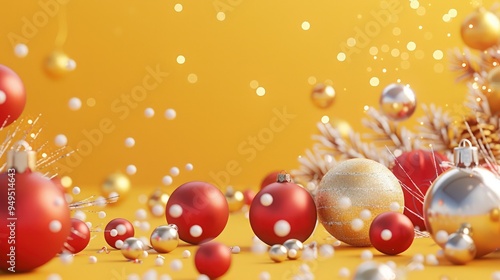 Christmas balls and decorations on a bright yellow background, perfect for holiday greetings, 3D rendering.