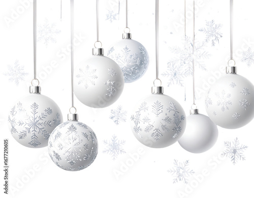 Christmas balls background. Hanging white Xmas decorative bauble, 3d silver metallic