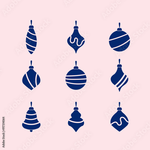 Christmas baubles and decoration silhouette collection. Retro Christmas ornaments and balls stickers in flat. Happy New Year and Merry Christmas decor
