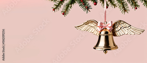 Christmas Bell Ornament with Angel Wings on Light Pink Background