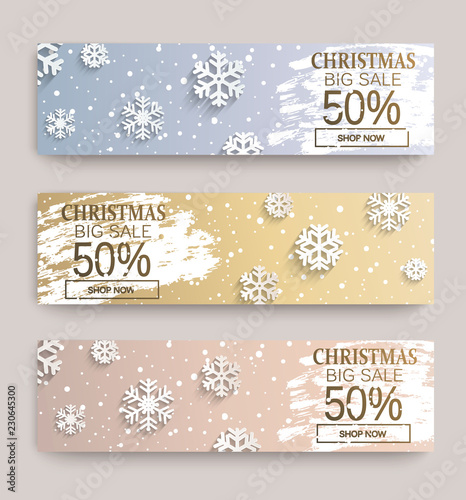 Christmas big sale banners with snowflakes on frosty design template. 50 percent Discount cards for web, poster, flyers, ad, promotions, blogs, social media, marketing. Vector illustration.