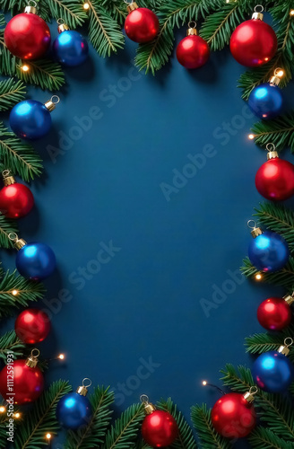 Christmas blue background with Christmas red and blue balloons and fir branches
