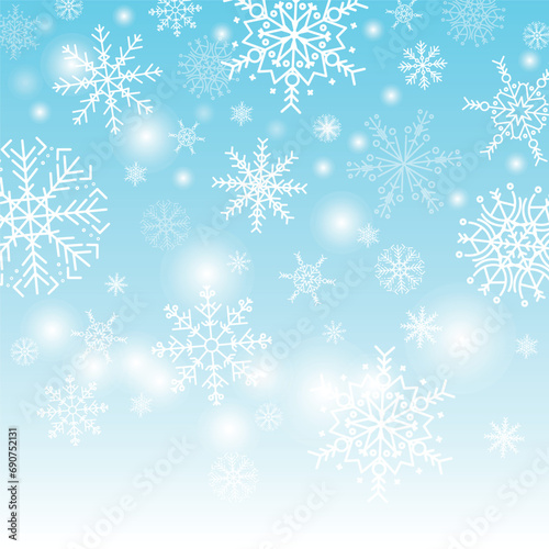 Christmas blue background with falling snow and snowflakes, magical winter sky with snowfall, fantasy shining snowy backdrop, vector illustration.