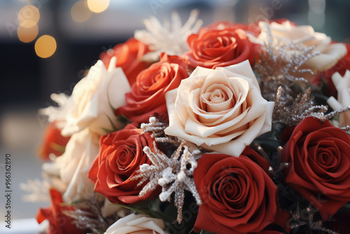 Christmas bouquet of flowers with red roses and Christmas decorative elements. Floral winter composition.