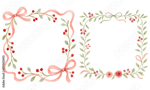 Christmas Bow and Berry Frame Clipart | Watercolor Green Leaves Border