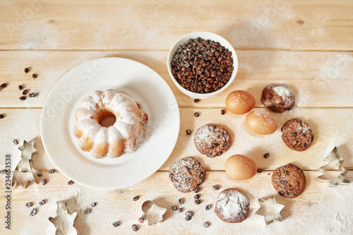 Christmas cake and cookies on table. Christmas decorations with lights background. Happy New Year! Christmas greeting card. Winter card template. Xmas concept. Holiday Banner. Feast of Nativity.