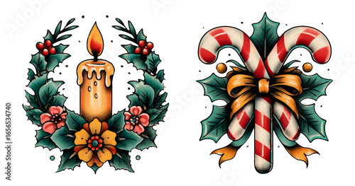 Christmas Candle and Candy Cane with Holly Wreath on Transparent Background