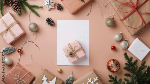 Christmas card adorned with festive decorations, featuring a vintage design and wooden elements, set against a backdrop of holiday cheer