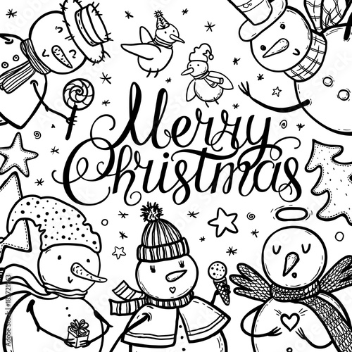 Christmas card design with holidays funny snowman, candy, snowflakes, birds, christmas tree. Merry Christmas black and white vector illustration