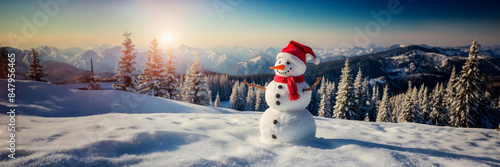 Christmas card, snowman, snow, forest, hat, scarf, template, concept, copy space.