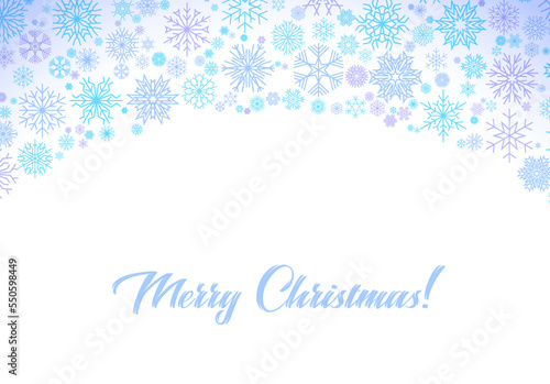 Christmas card with frame of blue and violet snowflakes with Merry Christmas holiday greeting.