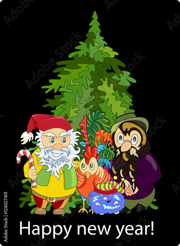 Christmas card with three gnomes, the symbol rooster and the Chr