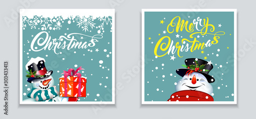 Christmas cards for your design. Two cute images with happy Snowman and merry snowman in retro style. Caption: Merry Christmas. Template for design: greeting cards, banners, posters. Vector graphic