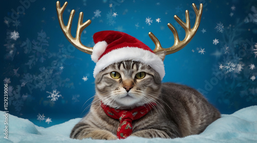 Christmas Cat with Santa Hat and Festive Decorations, gift box on the background of a Christmas tree