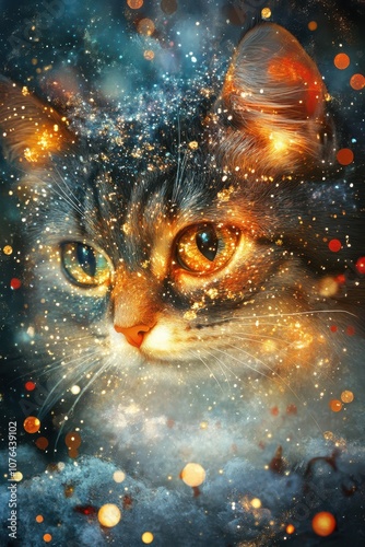 Christmas cat with sparkling coat: cat with fur shimmering with holiday sparkles, cozy home setting, warm and magical expression