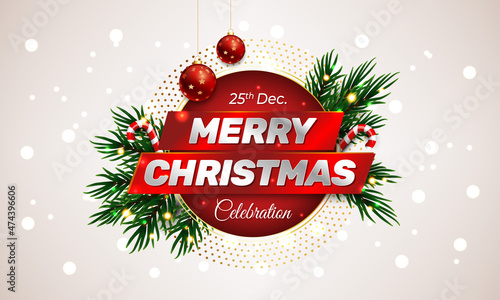 Christmas Celebration typographic design template with red frame fir branches sparkling lights and Christmas elements. Vector illustration isolated on white.