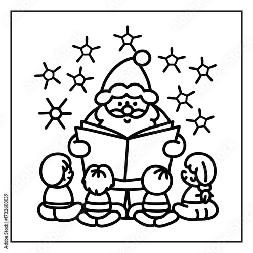 Christmas coloring page with festive holiday elements, Holiday season coloring page with Santa, gifts, and snowflakes, Black and white Christmas illustration with winter decorations