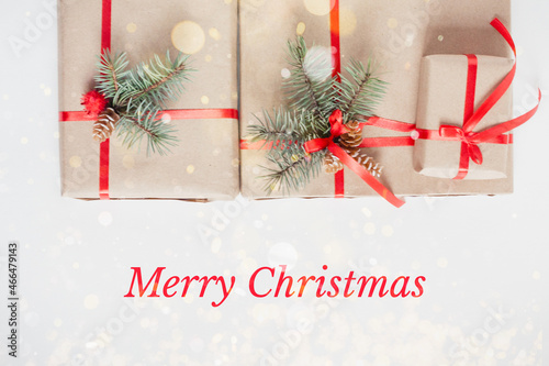 Christmas composition. Fir tree branches, red decorations, Handmade gifts on white background with golden bokeh and text with Merry Christmas wish. Winter, holiday concept. Flat lay, top view