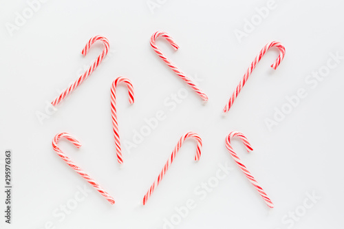 Christmas composition. lollipop canes on white background. new year concept. Greeting card, winter holidays, xmas celebration 2020. Flat lay, top view, copy space, mockup, template