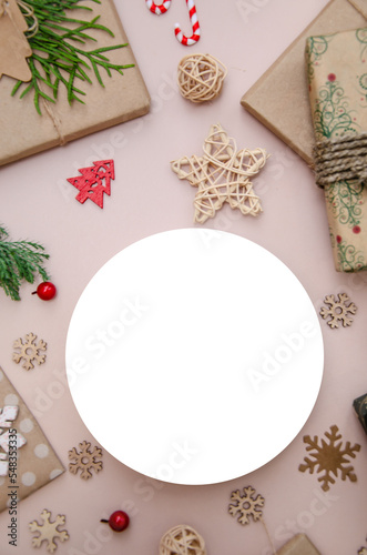 Christmas composition. Vertical flat lay composition with Christmas decorations and white round ad space. Round mock up.