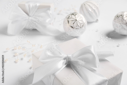 Christmas composition with gift box and decor on white background, closeup