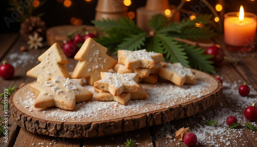 Christmas cookies shaped like stars and trees on wooden platter with festive decorations