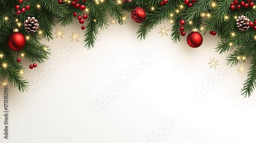 Christmas Corner Border with Pine Branches, Red Baubles, Berries, Pinecones and Twinkling Lights