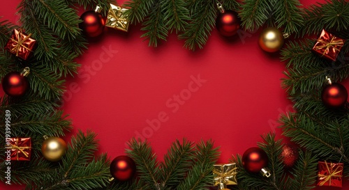 Christmas decoration, pine branches, red background, ornaments, baubles, festive
