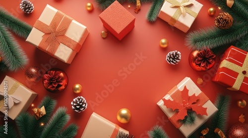Christmas decorations flat design, top view, cozy theme, 3D render, Split-complementary color scheme