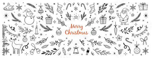 Christmas drawn xmas tree, leaf, holly flower background. Hand drawn doodle sketch holly floral, christmas tree leaves, winter pine. Holiday ornament, rustic wreath sketch doodle. Vector illustration