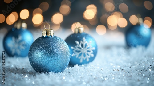 Christmas eve setting with blue ornaments on snowy ground, perfectly sparkling under the festive lights of the season.