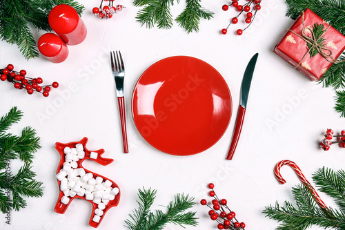 Christmas festive table setting with red dish, cutlery, gift, decorations and fir branches on white table.