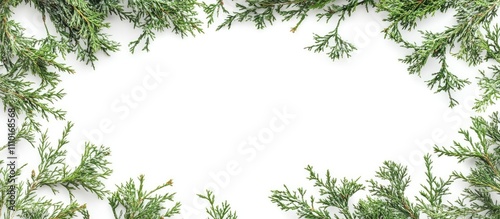 Christmas fir branch border on white background with flat lay arrangement, empty space for text or decorations, festive nature concept.