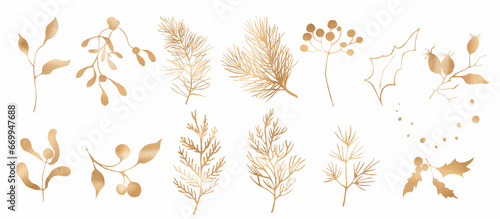 Christmas floral gold set. Hand painted illustration isolated on white background