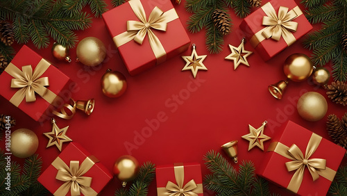 Christmas Frame with Red Gift Boxes Golden Ornaments and Pine Branches on Red Background