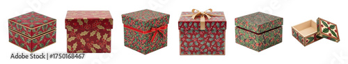 Christmas gift box set including closed, open, and ribbon-decorated boxes isolated. Festive holiday packaging collection.