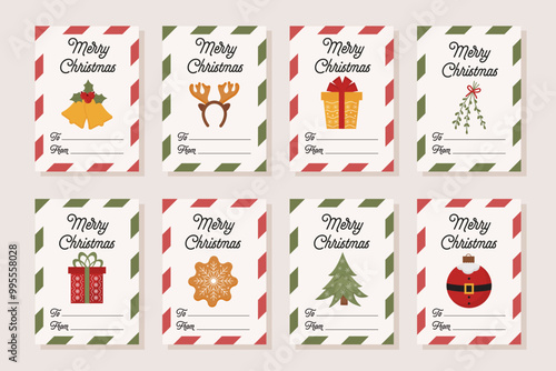 Christmas gift tags. Merry Christmas greeting, tags collection for gift packaging with characters in trendy modern style. Christmas tree, Santa, Gingerbread cookie, candy cane winter holiday elements.