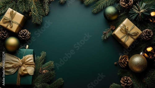 Christmas gifts & ornaments on dark green backdrop