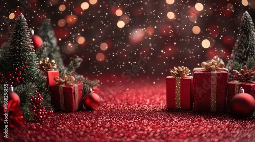 Christmas Gifts and Decorations on Red Glitter Background
