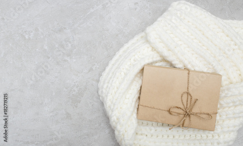 Christmas gifts box presents wrapped with a knitted white scarf.