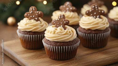Christmas gingerbread cupcakes with cream cheese frosting and mini gingerbread cookies on top on a wooden board.