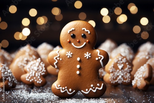 christmas gingerbread man cookies and snowflakes glazed over blurred bokeh background, copy space and Happy winter holidays concept. Merry Christmas and Happy New Year background.