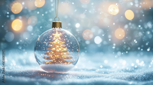 Christmas glass bauble with glowing tree and star inside lying on snowy surface, soft snow and light bokeh in magical winter scene