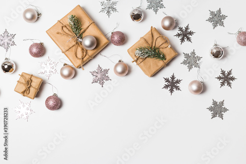Christmas greeting card. Gift boxes and Christmas decorations layout on an isolated white background, top view. Flat lay