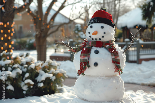 Christmas greeting card with bright winter holiday snowman and New Year background