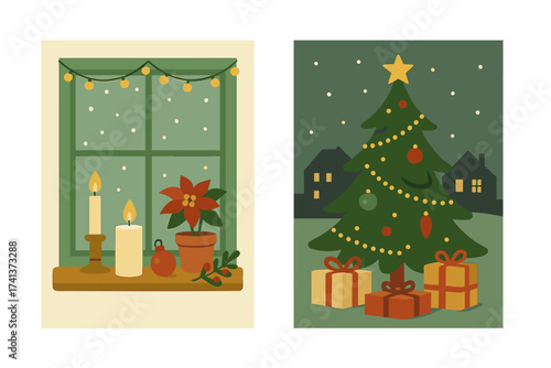 Christmas holiday poster set. Vector flat illustration. Festive winter scenes with Christmas tree, gifts, cozy window, candles, poinsettia. For greeting card, cover, brochure.