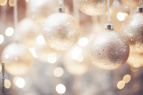 Christmas holiday theme, silver christmas balls, bokeh sparkling background. Generative AI