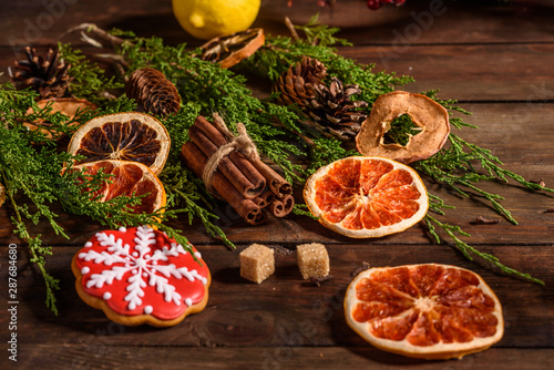 Christmas hot mulled wine with cinnamon cardamom and anise on wooden background