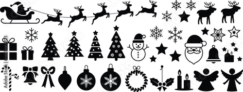 Christmas icons, Santa Claus sleigh, reindeer, Christmas trees, snowflakes, gifts, snowman, ornaments, bells, wreath, holiday decorations, festive symbols